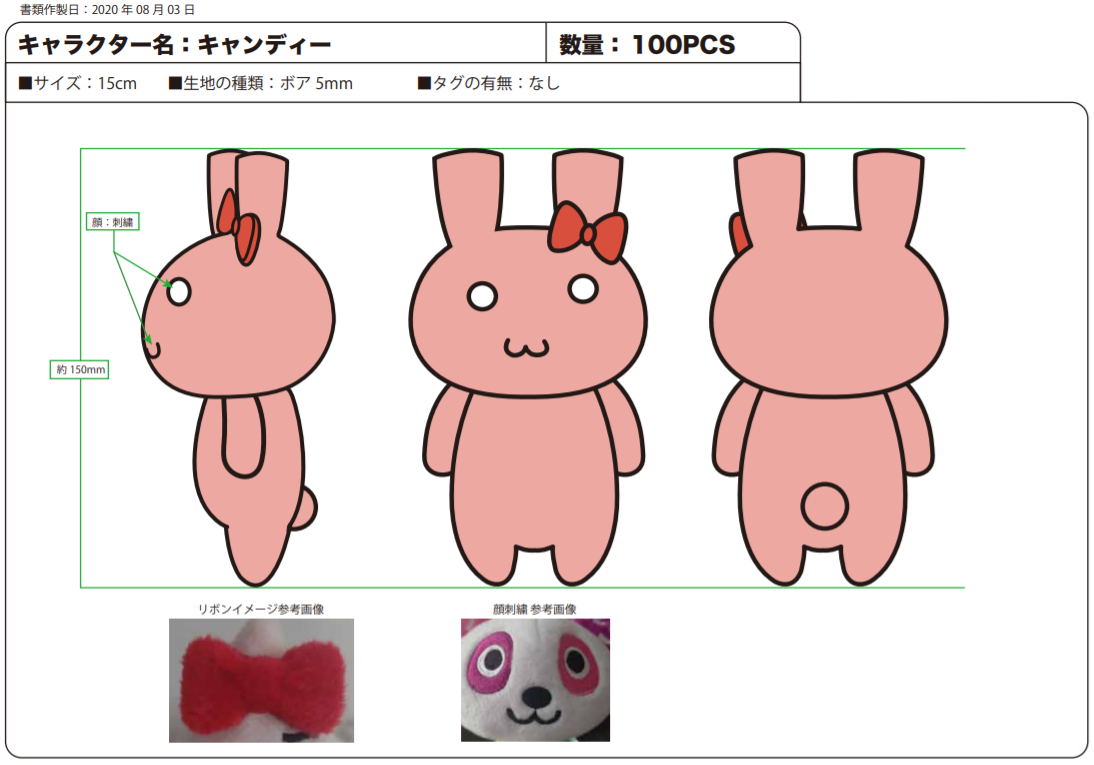 怪盗キャンディのぬいぐるみ工場発注!2020/08/04中国の工場でぬいぐるみを生産! ふわふわのボア生地に、イメージぴったりのピンク色を指定しました。